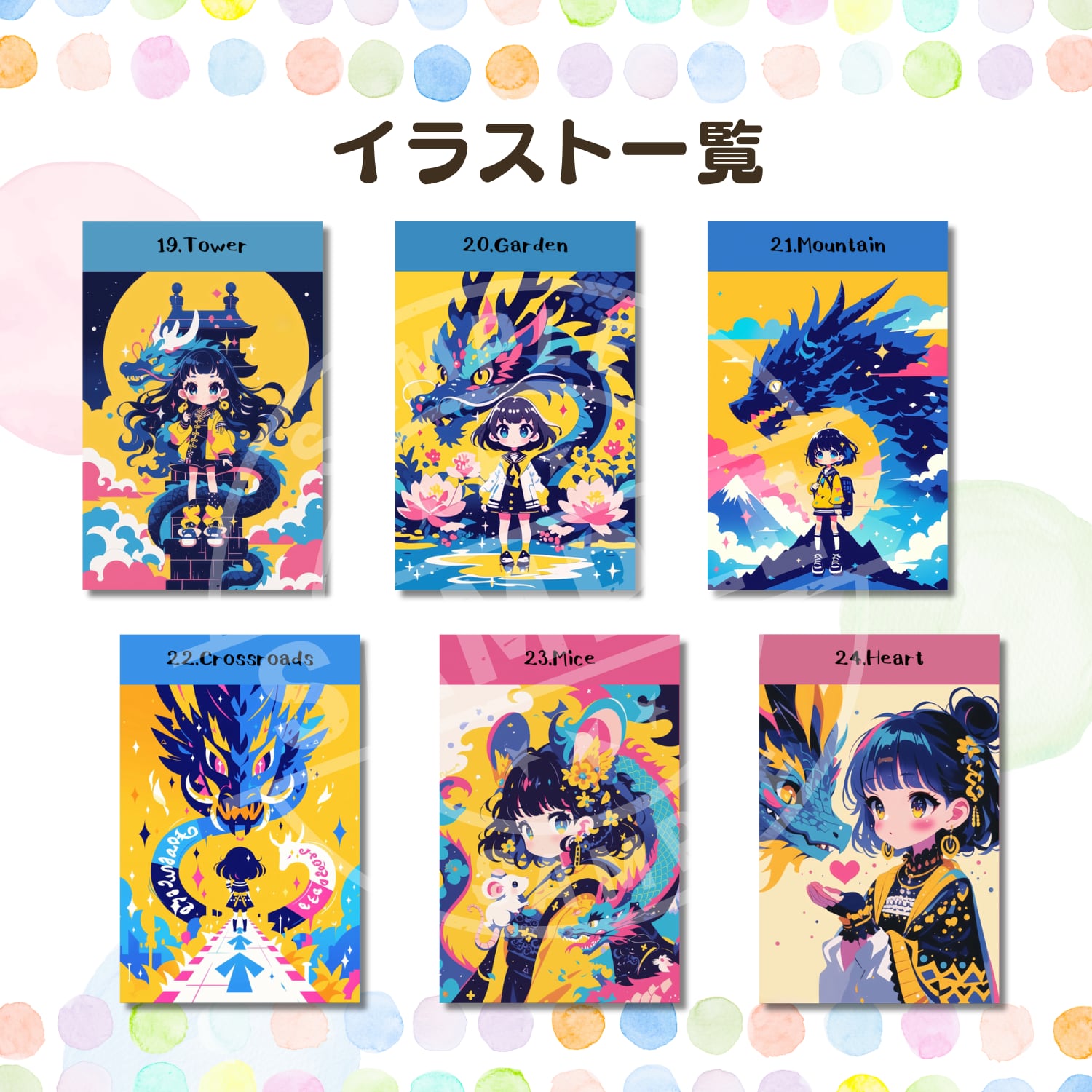 カラフルな龍神と少女たちが描かれたカードは、リーディングの時間を楽しく彩り、